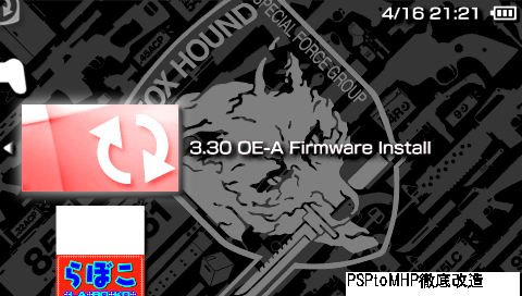 注意事項 3.30OE-Aを入れる条件として、ver1.50、TA-086基板よりも前の基板、メモリースティックフォーマット&設定の初期化をしたPSP、充電満タンでACアダプター差込の状態で実行してください。全て自己責任で行ってください。 欠落等あったら指摘御願します。 準備物 3.30 Open Edition Revision A カスタムファームウェア3.30 OE-A用DATA.DXAR STEP1 DLした、3.30 Open Edition Revision A を解凍後展開します。 そして、中に在る『330oeflasher』と『330oeflasher%』をms0:/PSP/GAME/に入れます。 次にDLした、3.30 OE-A用DATA.DXARを解凍後展開します。 そして、「3.30_OE-A_DATA.DXAR」内にあるファイル「DATA.DXAR」を、 「ms0:/PSP/GAME/330oeflasher/」に入れます。 STEP2 PSPで3.30 OE-A Farmware Installを起動して下さい。 起動後の画面 ↑になったら、『実行するなら×ボタンorやめるならRボタン』でインストールが開始されます。